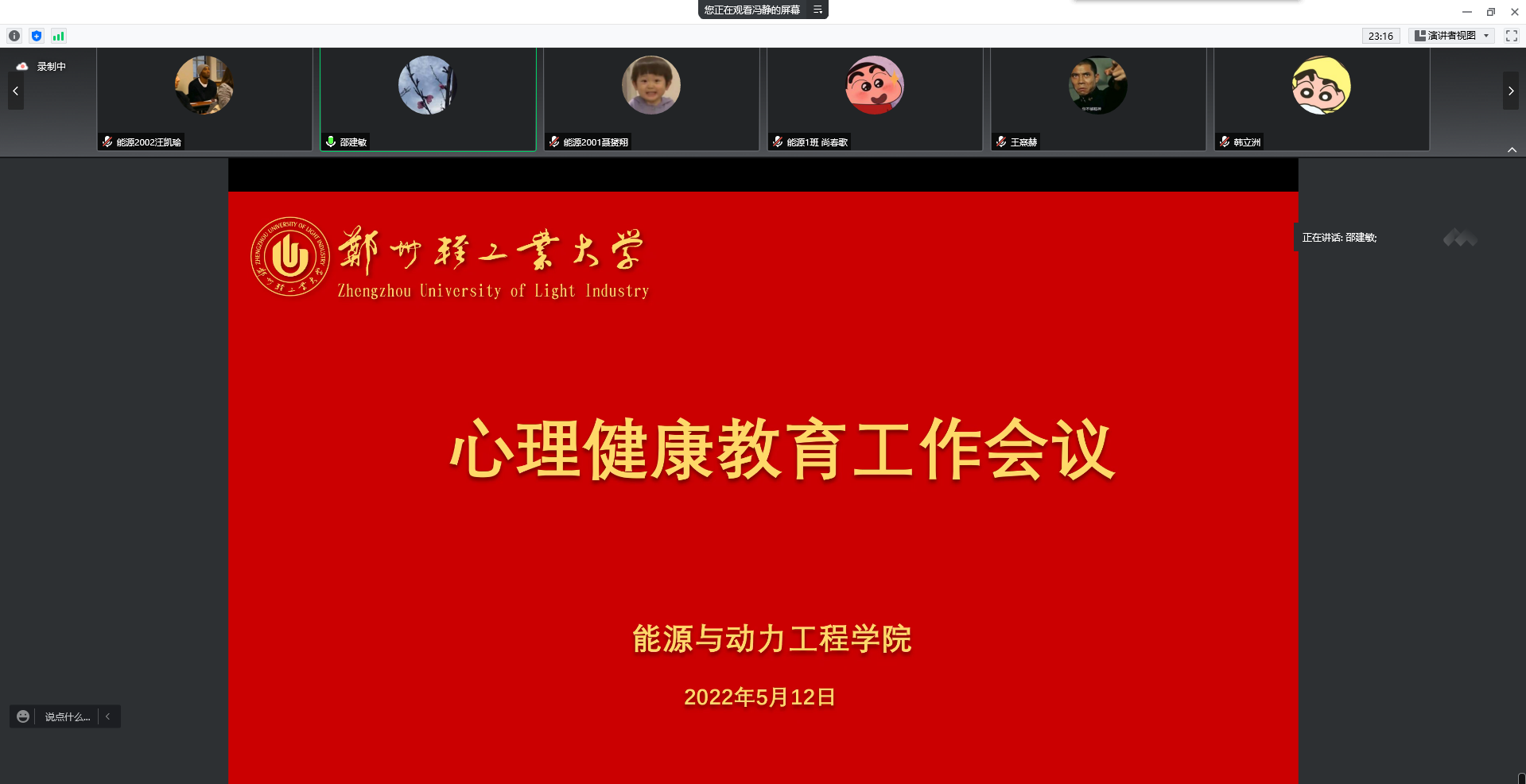 为进一步做好大学生特殊时期的人文关怀和心理疏导,5月12日下午,能源与动力工程学院通过腾讯会议召开心理健康教育工作会议。学院党委书记邵建敏老师、心理专职辅导员刘渊博老师、心理中心成员及各班心理委员参加此次会议,会议由刘渊博主持。