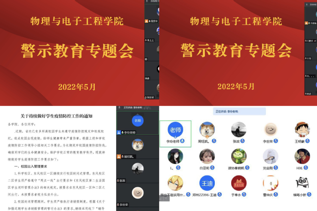 为进一步强化学生疫情防控责任意识,自觉遵守校规校纪和疫情防控各项规定,5月14日下午,物理与电子工程学院全体辅导员以班级为单位线上召开了警示教育专题会。