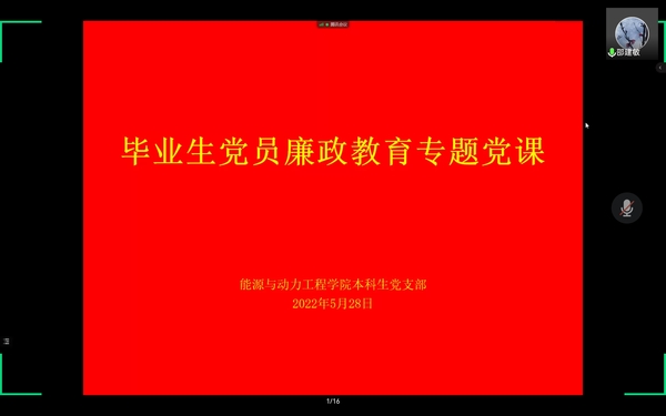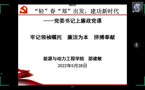 为扎实做好毕业生廉政教育,增强党员廉政意识,5月28日,能源与动力工程学院党委书记邵建敏通过腾讯会议,以“牢记领袖嘱托、廉洁为本、拼搏奉献”为主题,给2022届毕业生党员上了一节生动的廉政专题党课。