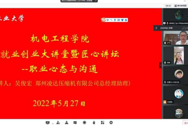 此次讲座邀请了郑州凌达压缩机有限公司总经理助理吴俊宏主讲,吴俊宏经理结合自身经历讲述了如何从学校人到职场人、个人职业的规划和心态、职场技巧、三现主义与沟通等四个方面内容。他指出,就业作为一个人生的转折点,同学们要做好从学校人变成企业人、职场人的准备。要懂得处理职场中的人际关系,尽自己最大的努力发挥自己的潜能。吴经理勉励广大学子无论在学业上还是工作中都要始终保持学习和思考的习惯,选择好人生的方向快速融入职场,实现个人价值的提升与逆袭,将自身志向与国家建设事业结合起来,把个人前途融入国家发展大局之中,与祖国共同进步共同发展。