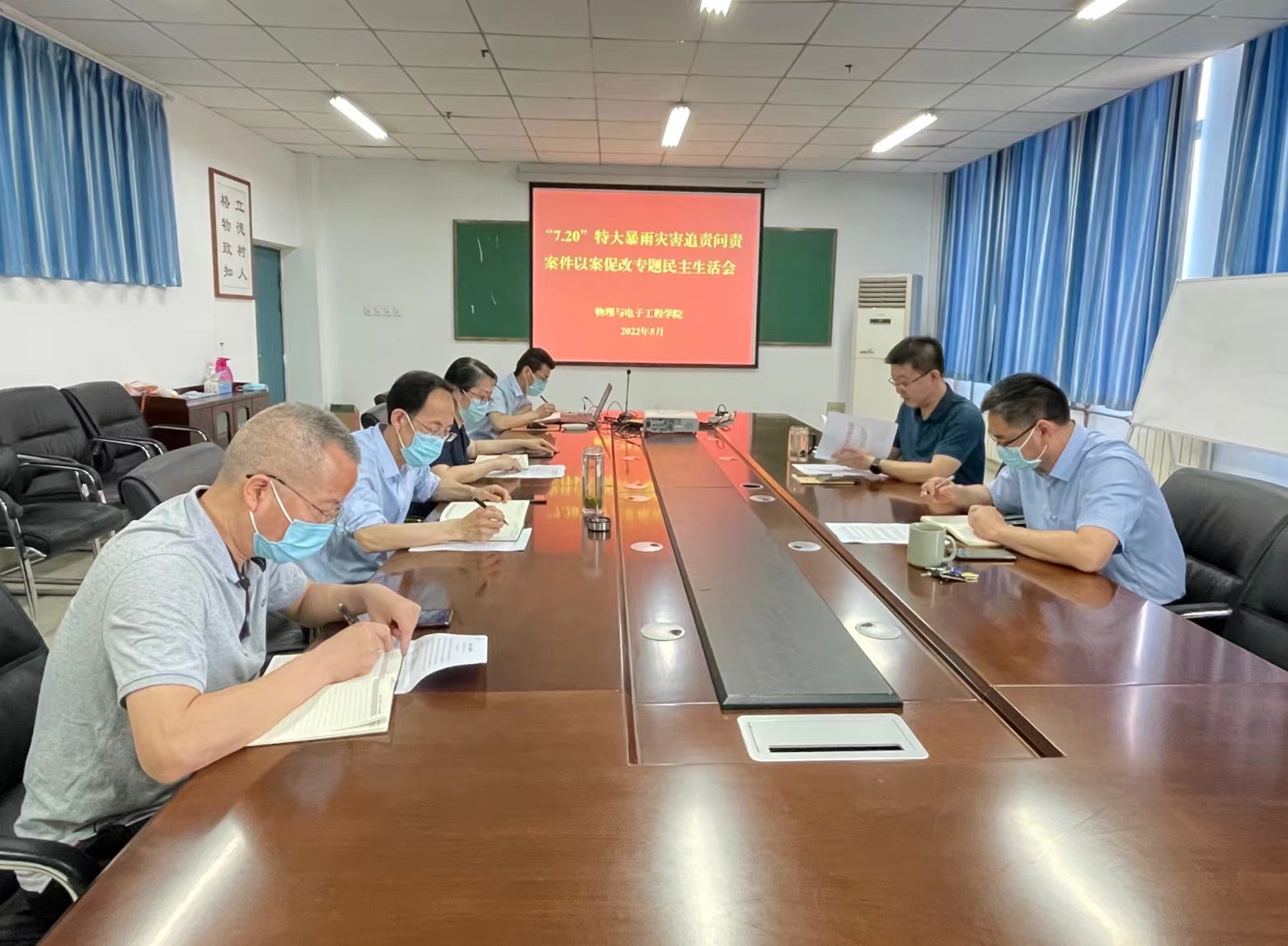 按照学校党委《关于深刻汲取“7·20”特大暴雨灾害追责问责案件教训开展以案促改专题民主生活会的通知》要求,5月27日下午,物理与电子工程学院在四教楼510召开了领导班子“7·20”特大暴雨灾害追责问责案件以案促改专题民主生活会。学院全体班子成员参加了会议,非党员班子成员列席会议。会议由学院党委书记赵阳主持。