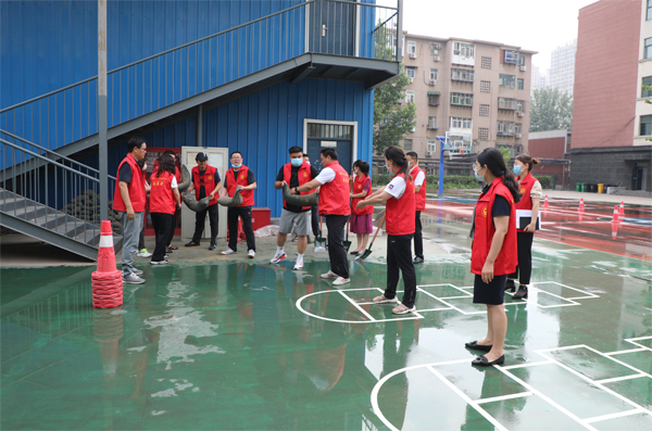 在教学楼一楼大厅,附属学校副校长张宁主持防汛应急抢险演练动员会,明确防汛工作职责和要点,号召全体队员严格履行职责,服从命令、听从指挥、尽心尽力、忠于职守,树立高度的责任感,发扬不怕苦、不怕累、不怕牺牲精神,扎实开展应急救援工作。倍增工程实验楼下,张校长带领防汛抢险救援队员熟悉防汛物资存放的位置、数量、使用方法及学校重点防汛部位,做到人人心中有数,人人都会使用。防汛抢险救援队还演练模拟暑期突遇强降水,校园内排水不及、水位速涨情况的应急处置。值班人员发现险情后,立刻向带班领导报告,接报后立刻启动应急预案;抢险救援队员迅速赶到学校,根据现场情况,分为两队进行抢险救灾,第一队抢救重要物资移至高处,另一队迅速安装挡水板、堆放沙袋。