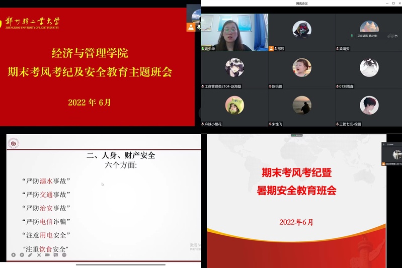 为进一步推动学风建设,培养良好的考风考纪,为线上期末考试做好充分的准备,全力做好学生暑期安全教育工作,确保学生度过一个安全、愉快且有意义的假期,6月20日-24日,经济与管理学院组织全体学生线上开展期末考风考纪教育暨暑假安全教育主题班会。