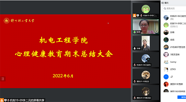 2022年06月28日下午,机电工程学院在线上召开了心理健康教育工作期末总结大会,学院党委副书记孙琳、心理专职辅导员老师徐莉、心理部成员及各班心理委员参加了此次会议。