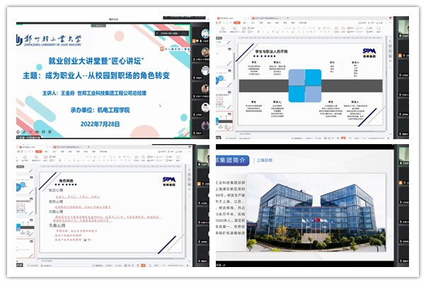 7月28日上午,机电工程学院通过腾讯会议举办就业创业大讲堂暨匠心讲坛活动,此次大讲堂邀请了我院优秀校友、上海世邦工业科技集团公司总经理、河南黎明重工科技股份有限公司董事王金府主讲《成为职业人--从校园到职场的角色转变》,学院党委副书记孙琳,就业创业工作老师吕志斌和各年级学生代表300余人参加了此次活动。