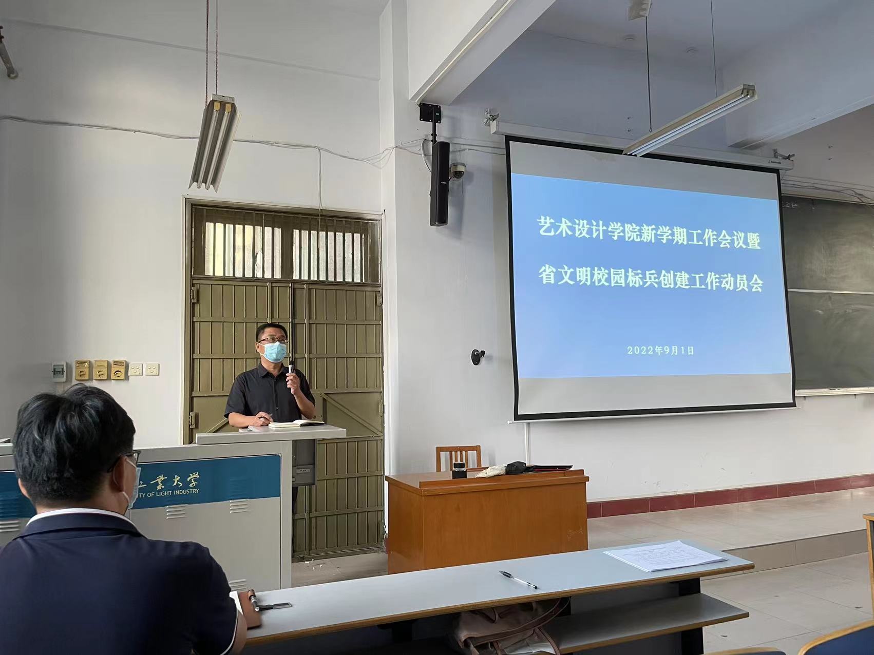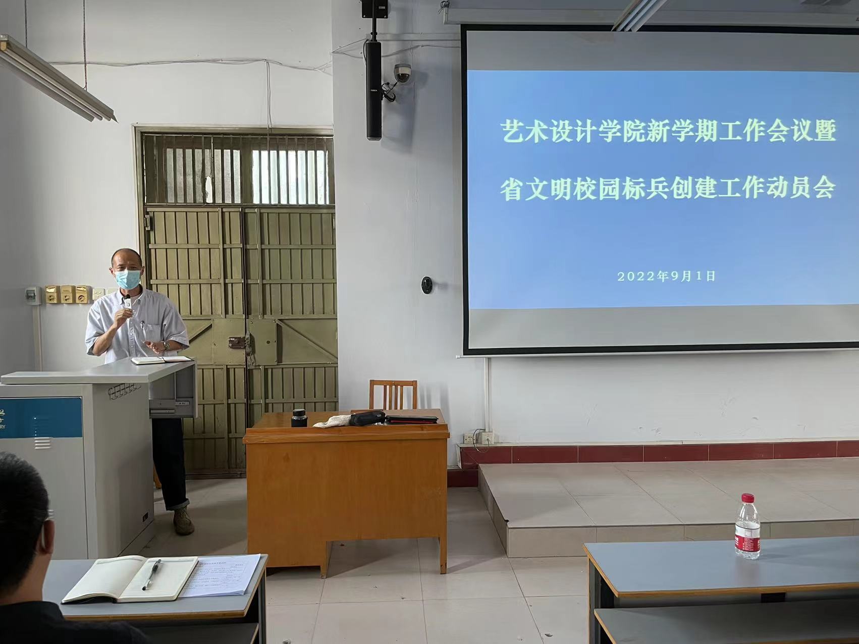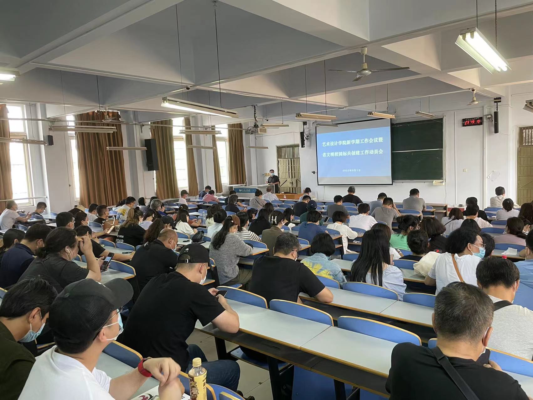 2022年9月1日下午,在西五楼514阶梯教室,艺术设计学院召开新学期工作会议暨省文明校园标兵创建工作动员会,会议主要内容是传达学校新学期会议精神,总结回顾学院暑期重点工作,分析当前我院形势任务,安排布置下阶段重点工作。