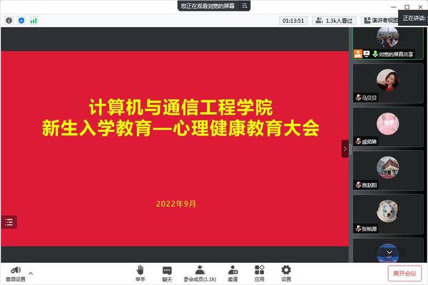 2022年9月7日晚,计算机与通信工程学院通过在线网络研讨会的形式开展了新生心理健康教育大会。本次大会旨在让新同学们正确认识自我,肯定自身价值,提升同学们对新环境的适应能力,迎接崭新的大学生活。