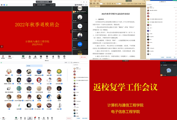 为进一步做好常态化疫情防控下学生教育工作,93日至9日,计算机与通信工程学院分别组织召开了2022年秋季本科生返校复学线上主题班会,结合郑州市疫情防控要求和学校具体返校计划,讲解相关秋季返校的注意事项。学院专兼职辅导员、班主任和全体同学分别在“云端”见面,参与本次主题班会。