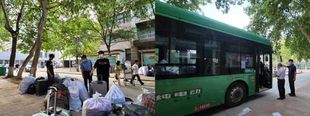 9月14日清晨,搬迁工作正式开始,25辆摆渡车按班级载着学子从东风校区出发,前往科学校区。摆渡车辆抵达后,顶着炎炎烈日,志愿者主动上前迎接,热情地从同学们手中接过一件件行李,指引同学们走进新宿舍。