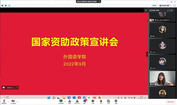 为进一步加强国家资助政策的宣传,更好推进新学期学生资助工作顺利开展,近期,外国语学院召开了国家资助政策线上宣讲会,全体2022级新生参加了会议。学院负责资助工作的矫菲老师做资助政策“两节课”宣讲。