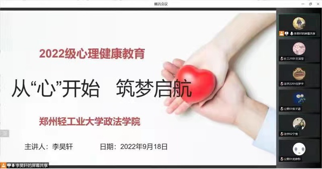 为帮助新同学尽快适应新阶段的学习生活,迅速完成向新角色的转变,奠定积极向上、乐观开朗的人生基调,近日,政法学院面向2022级新生举办“从心开始,筑梦启航”新生心理健康教育线上讲座。讲座由学院心理健康教育专职老师李昊轩主讲。