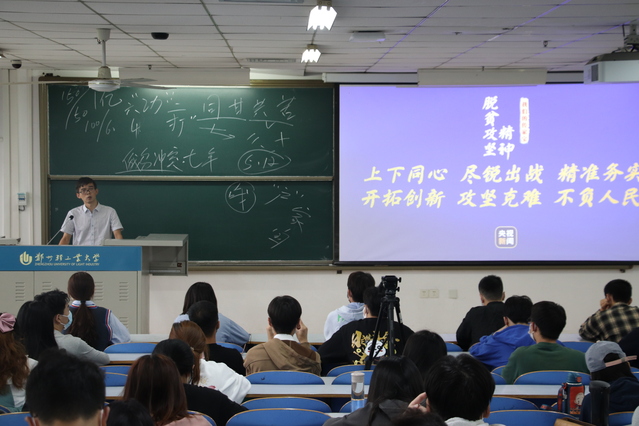 闫茂伟老师通过习近平总书记2021年2月25日在全国脱贫攻坚总结表彰大会上的讲话拉开此次课程的序幕,详细、具体地向同学们讲述了脱贫攻坚战的过程,以骆驼湾村八年的变化为例,展示了自2015年来我国贫困县数量持续下降的情况。课堂上闫老师用图片、图表等方式让同学们清楚直观地感受到了脱贫攻坚战中教育、饮水、交通等方面取得的成果,并以自己当年上学的事迹为例,讲述这个成果的来之不易,他感叹:“农村教育的变化真的很大,大到我们都不敢想象!”。