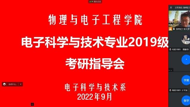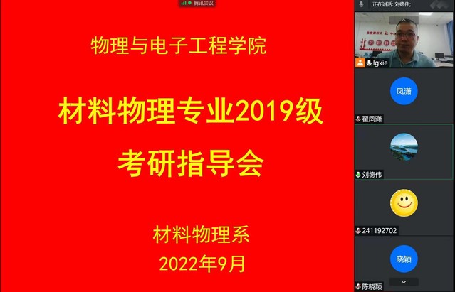 在学生考研咨询及预报名之际,为帮助同学们更好地了解考研形势,有效促进同学们针对性地备考,物理与电子工程学院近日组织了专业老师为考研学子进行考研指导。会议以线上形式进行,副院长刘德伟、电子科学与技术系主任张志峰、材料物理系主任谢罗刚及部分专业教师、2019级电子科学与技术及材料物理两个专业学生参加了本次会议。