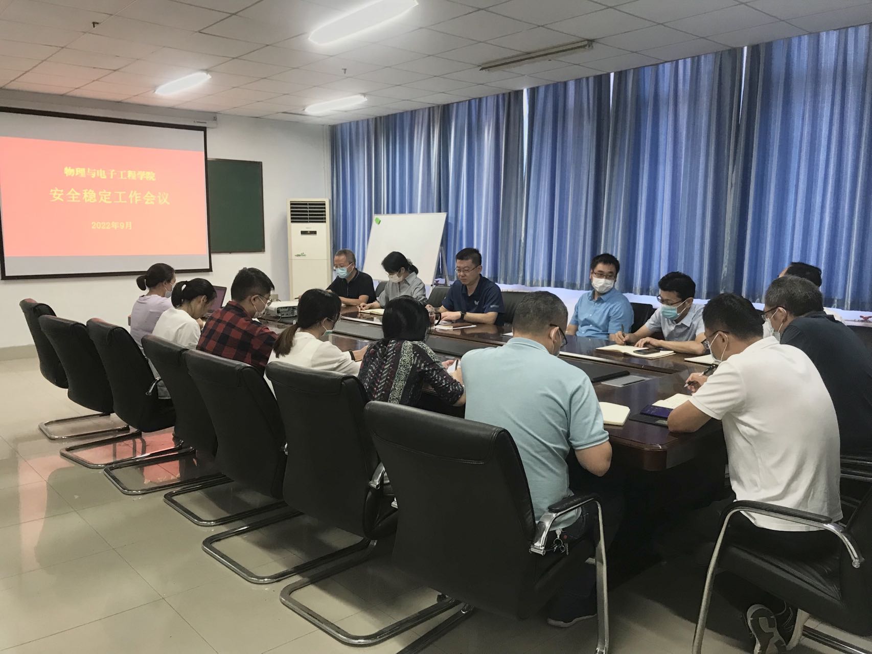 9月29日下午,物理与电子工程学院在科学校区四教楼510会议室召开安全稳定工作会议,传达学校安全稳定工作会议精神,安排部署学院近期重点工作。学院领导班子、系部负责人、支部书记和辅导员参加会议,会议由党委书记赵阳主持。