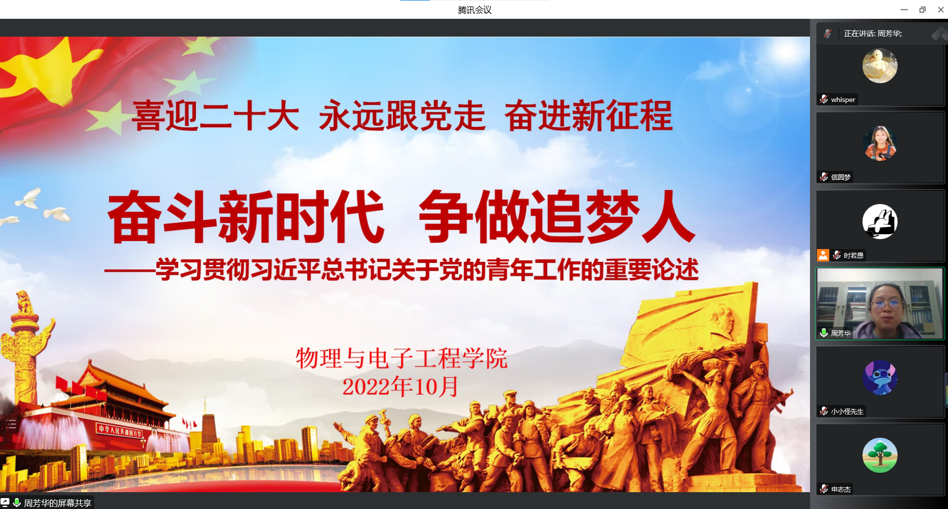 为深入学习贯彻习近平总书记关于党的青年工作的重要论述,10月9日,物理与电子工程学院线上开展“喜迎二十大,永远跟党走,奋进新征程”主题宣讲活动,活动由校青年讲师团成员周芳华老师主讲,学院2022级全体团干和团员代表参会学习。
