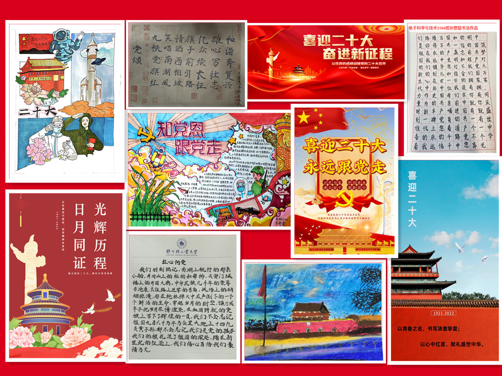 经过前期宣传动员,同学们踊跃报名参加,共收到作品31幅,作品形式包括摄影、海报、书法、绘画、诗歌、散文等。同学们的参赛作品创意鲜明,各具特色,其中海报《喜迎党的二十大》、书法作品《党颂》、手抄报《知党恩 跟党走》、诗歌《喜迎二十大》、摄影作品《蒸蒸日上》等作品展现了同学们对党的二十大胜利召开的喜悦,“薪火相传二十大,继往开来新征程”更是同学们从内心深处表达对党的信赖与支持。