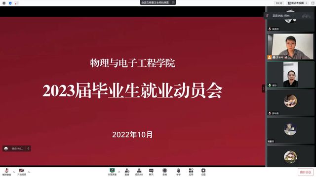 10月24日晚,物理与电子工程学院于线上召开2023届毕业生就业动员会。学院党委副书记李玲、就业专职辅导员王伟夙、2019级全体本科生参加了会议。