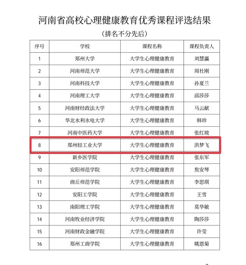 近日,中共河南省委教育工委、河南省教育厅发布了《关于公布全省高校心理健康教育优秀课程评选结果的通知》,我校学工部心理健康教育中心洪梦飞负责申报的“大学生心理健康教育”课程成功入选。