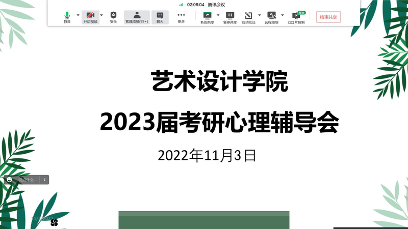 为帮助2023届考研学生了解考场技巧,调整考前心态,缓解心理压力,11月3日,艺术设计学院组织召开了线上2023届考研心理辅导会,2019级辅导员以及考研学生参加本次会议,本次会议由学院心理健康教育专职辅导员老师胡新月主持。