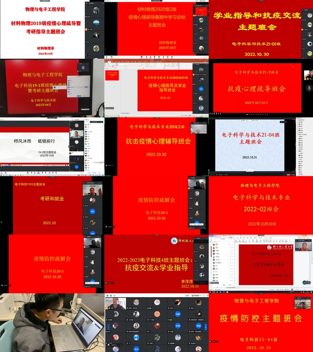 为深入了解疫情防控期间学生整体思想和学习生活状况,有效帮助学生解决学业、心理困惑。近期,物理与电子工程学院组织全体班主任线上开展了学业指导与心理疏导主题班会。