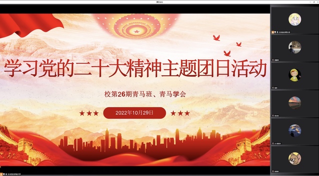 为认真学习宣传贯彻党的二十大精神,近日,我校青马班、青马学会线上举办了学习党的二十大精神主题团日活动,活动由青马班团支书张培莹主持,青马指导老师、青马班学员、青马学会会员代表参加活动。