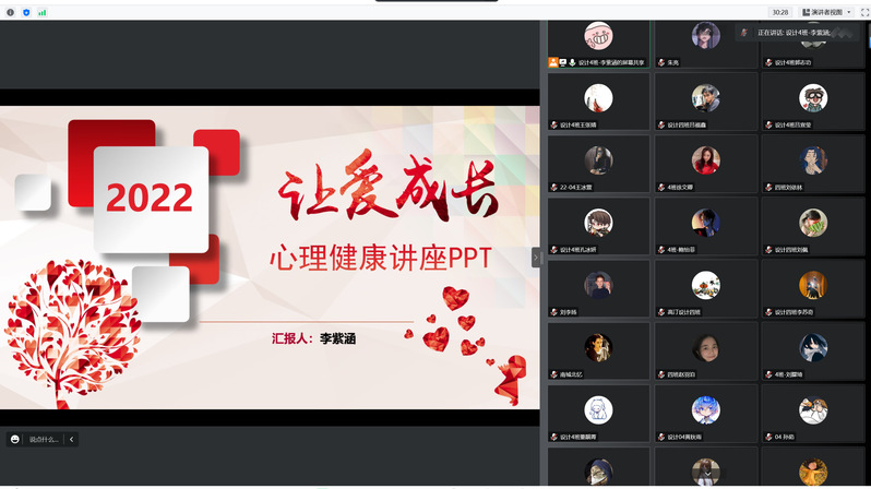为加强学生心理健康教育,提高学生心理调节能力,11月5日-11月12日,艺术设计学院组织开展了以“疫情下的情绪管理”为主题召开心理班会,各班心理委员认真组织,班会形式丰富,内容有趣,心理健康学生骨干和2022级全体学生参与了本次活动。