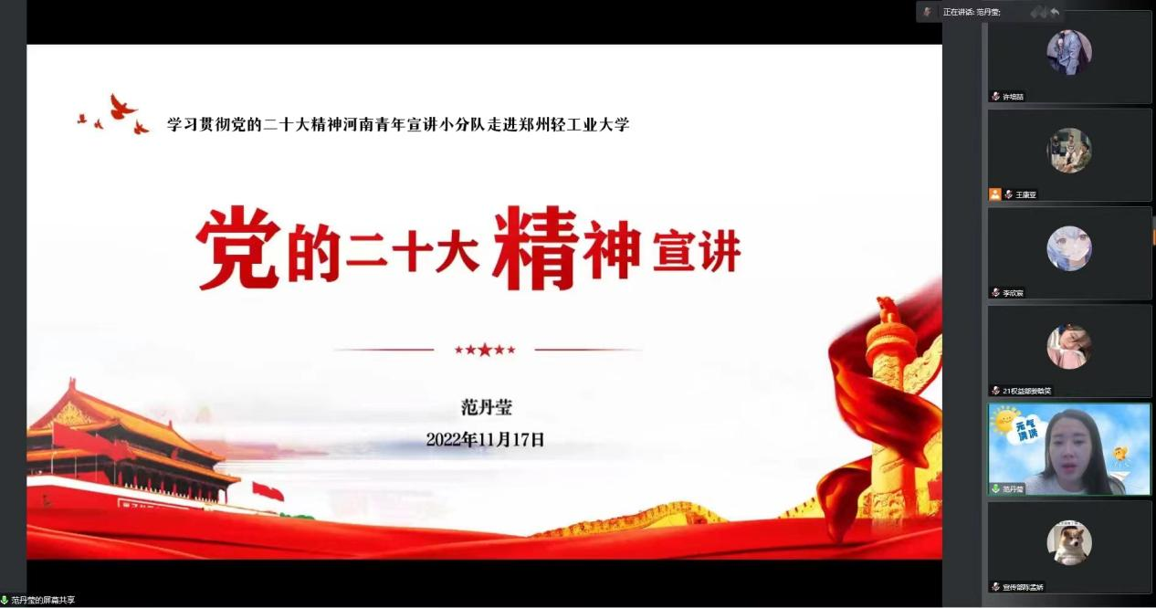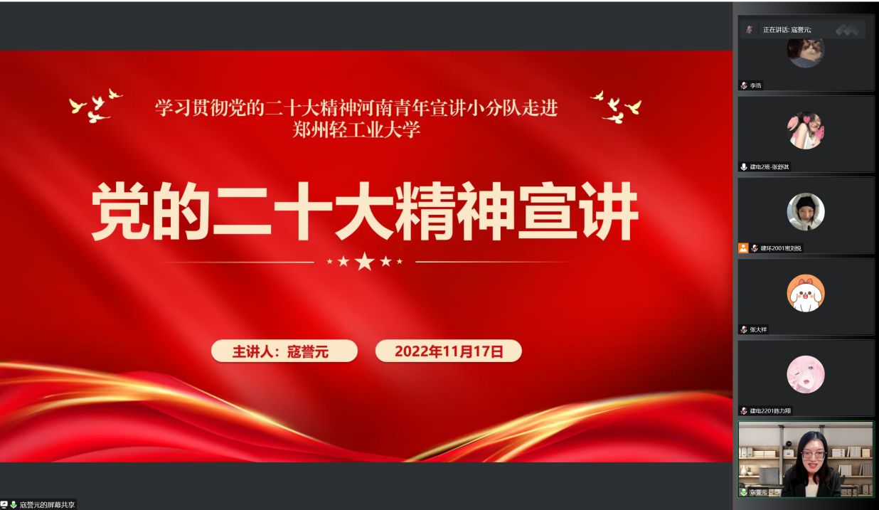 根据《河南共青团关于组织开展学习贯彻党的二十大精神宣讲活动的通知》(豫青字2022[31]号)要求,11月17日,学习宣传贯彻党的二十大精神河南青年宣讲小分队成员寇誉元、范丹莹以线上会议的形式分别在我校作主题宣讲。建筑环境工程学院团校培训班全体学员、学生社团服务中心科学校区全体学生骨干参与宣讲会。