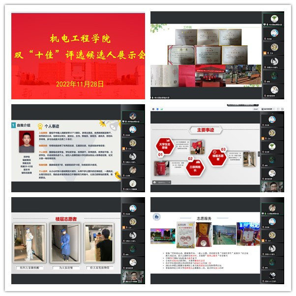 按照学校《关于评选2022年度 十佳“轻大之星”、十佳“自强之星”的通知》要求,11月28日,机电工程学院通过腾讯会议线上召开双“十佳”评选候选人展示会。学院党委副书记孙琳、全体辅导员及学生代表参加了展示会。