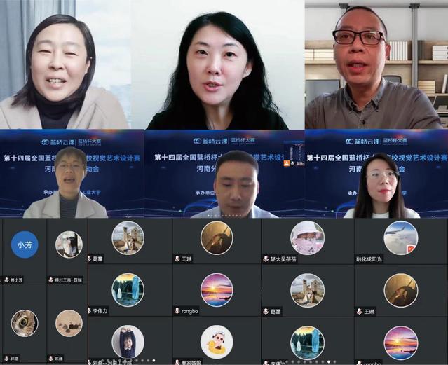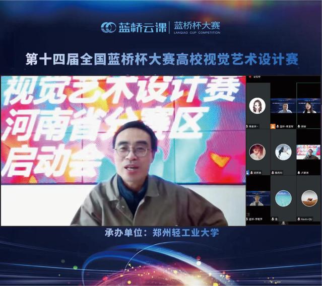 2022年11月23日,由我校艺术设计学院承办的“第十四届全国蓝桥杯大赛高校视觉艺术设计赛”河南分赛区启动会成功举行。会议采用线上方式进行,蓝桥杯大赛组委会及郑州大学美术学院、河南大学美术学院、河南师范大学美术学院、河南工业大学设计艺术学院、河南工程学院艺术设计学院等30多所省内高校相关院系的领导、专家参加了此次会议。启动会按照“组委会致辞、分赛区情况介绍、组织构架介绍、特邀嘉宾发言、参会嘉宾线上讨论”等议程依次展开。会议由蓝桥杯大赛高校视觉艺术设计赛组委会薛颖老师主持。