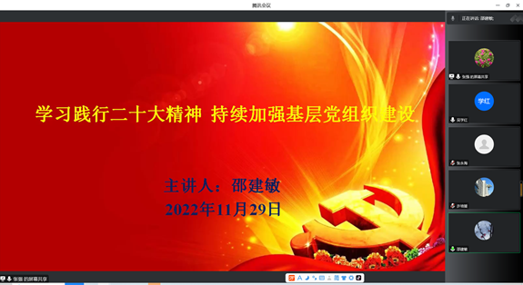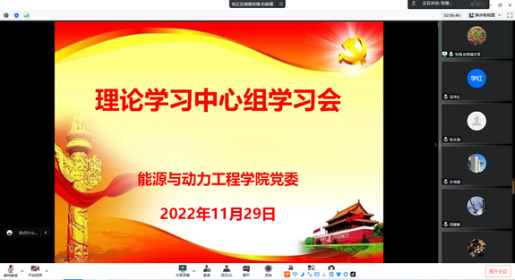 2022年11月29日下午,能源与动力工程学院通过腾讯会议线上方式,召开党委理论学习中心组学习会,集中学习党的二十大会议精神。学习会由学院党委书记邵建敏主持,全体党委委员参加。