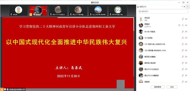 为深入学习党的二十大精神,团结引领广大青年学子紧跟党的步伐,迈向新征程,取得新胜利。计算机与通信工程学院(电子信息工程学院)于11月30日举办“学习贯彻党的二十大精神”专题宣讲会。此次会议邀请到马克思主义学院易善武老师担任主讲老师,第四组青马工程培训班学员参会学习。