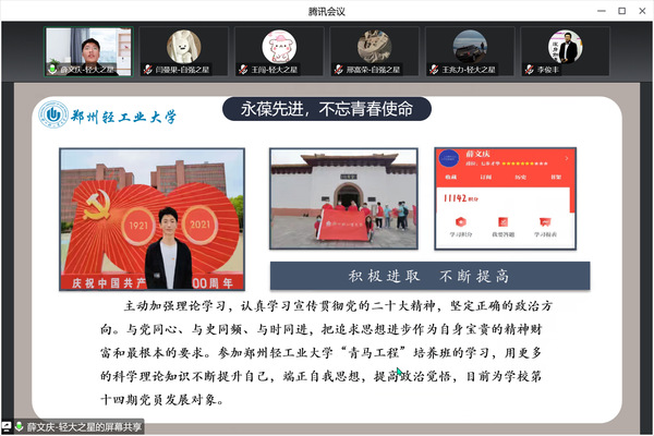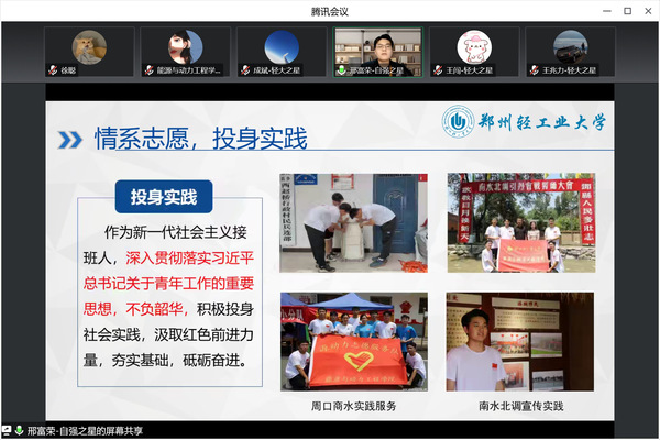 经过前期自主申报、资格审核,学院共推选出7位同学进行线上答辩环节。各位同学从政治理论水平、学习情况、疫情防控、创新创业、艰苦奋斗等方面进行论述。他们之中,有人在求学路上厚积薄发、精进勤学;有人在科研道路上愈挫愈勇、勇往直前;有人在志愿活动中无私奉献、乐于助人,展现了当代大学生的青春风采。答辩结束后,李俊丰老师对各位同学的先进事迹和取得的成果给予肯定,赞扬了各位同学追求卓越的心态与自强不息的品格,鼓励能动学子常怀感恩之心,积极投身志愿活动,汇聚磅礴的青春力量!