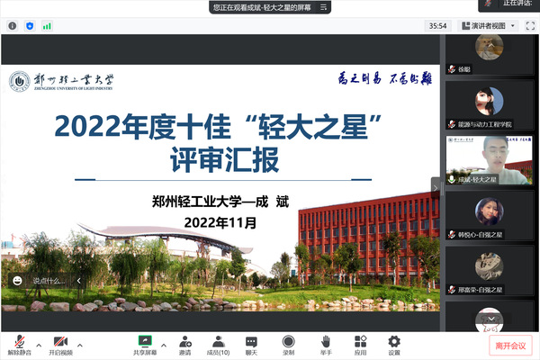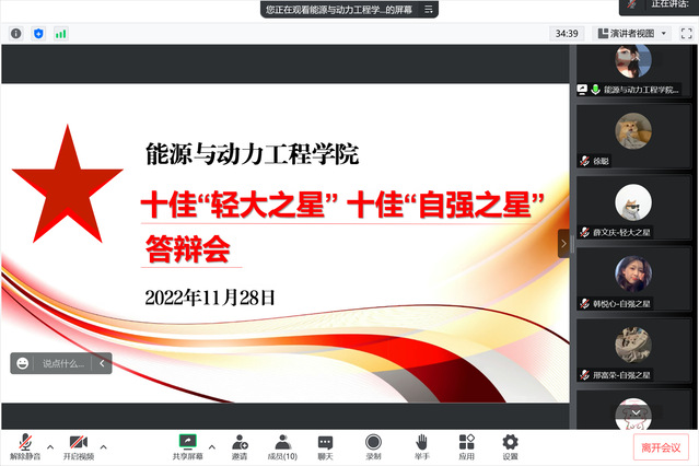 为充分发挥优秀典型的模范引领作用,展示大学生的时代精神风貌,全面落实立德树人根本任务,能源与动力工程学院11月28日在线上举办了2022年度十佳“轻大之星”、十佳“自强之星”评审答辩会。学院院长许培援、学院党委副书记李俊丰、各年级辅导员及学生代表参加了此次活动。