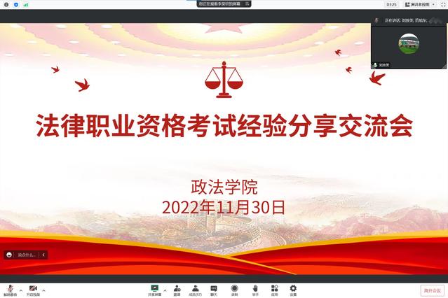为帮助同学们深入了解法律职业资格考试,明确备考方向和目标,提升就业竞争力,1130日晚上,政法学院举办法律职业资格考试经验分享线上交流会。会议邀请四位通过法考的法学专业毕业生主讲,学院党委副书记刘放美以及学院各年级一百四十余名学生参加会议,会议由就业专职老师李昊轩主持。