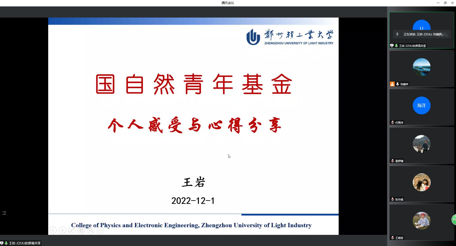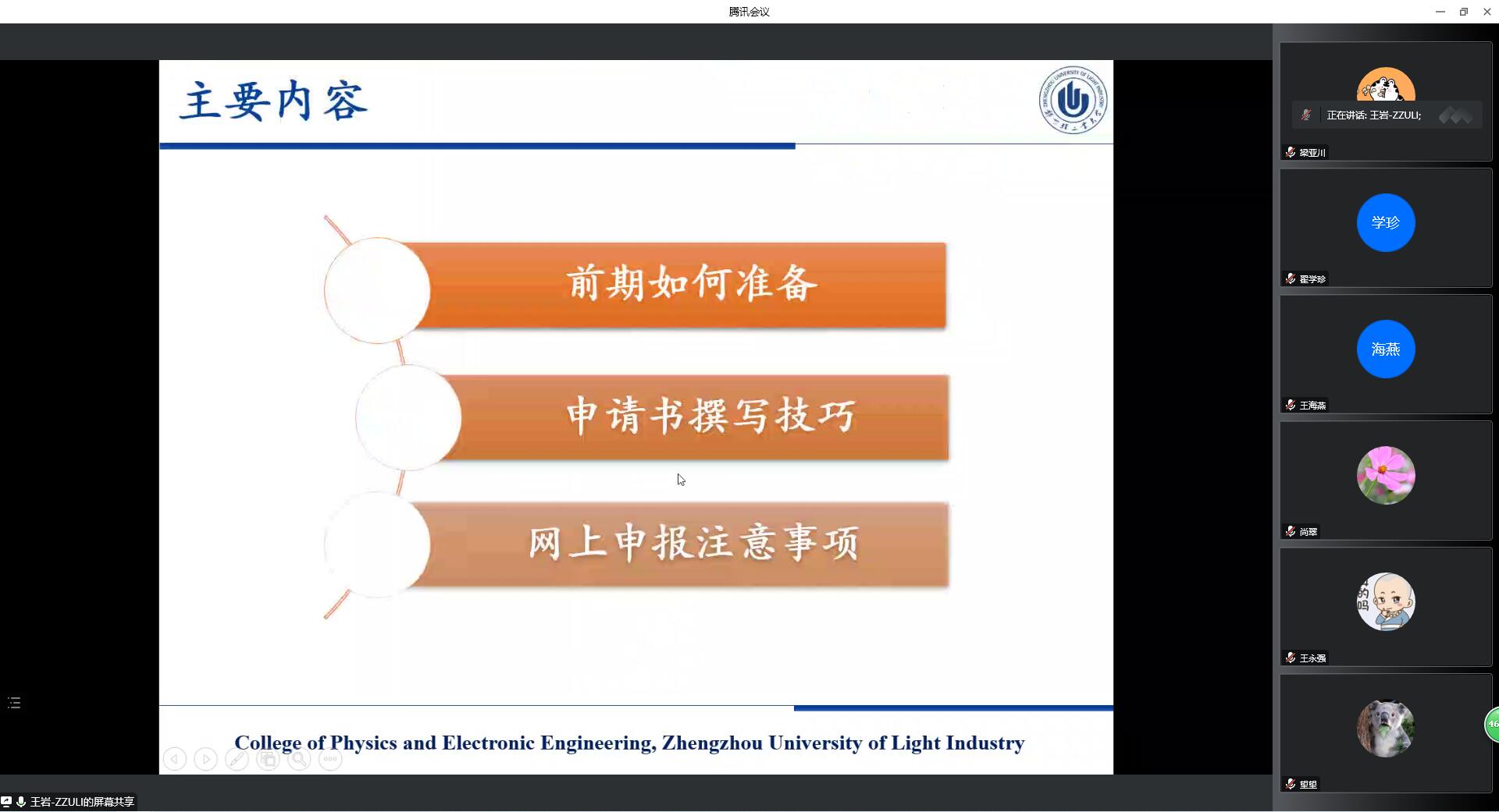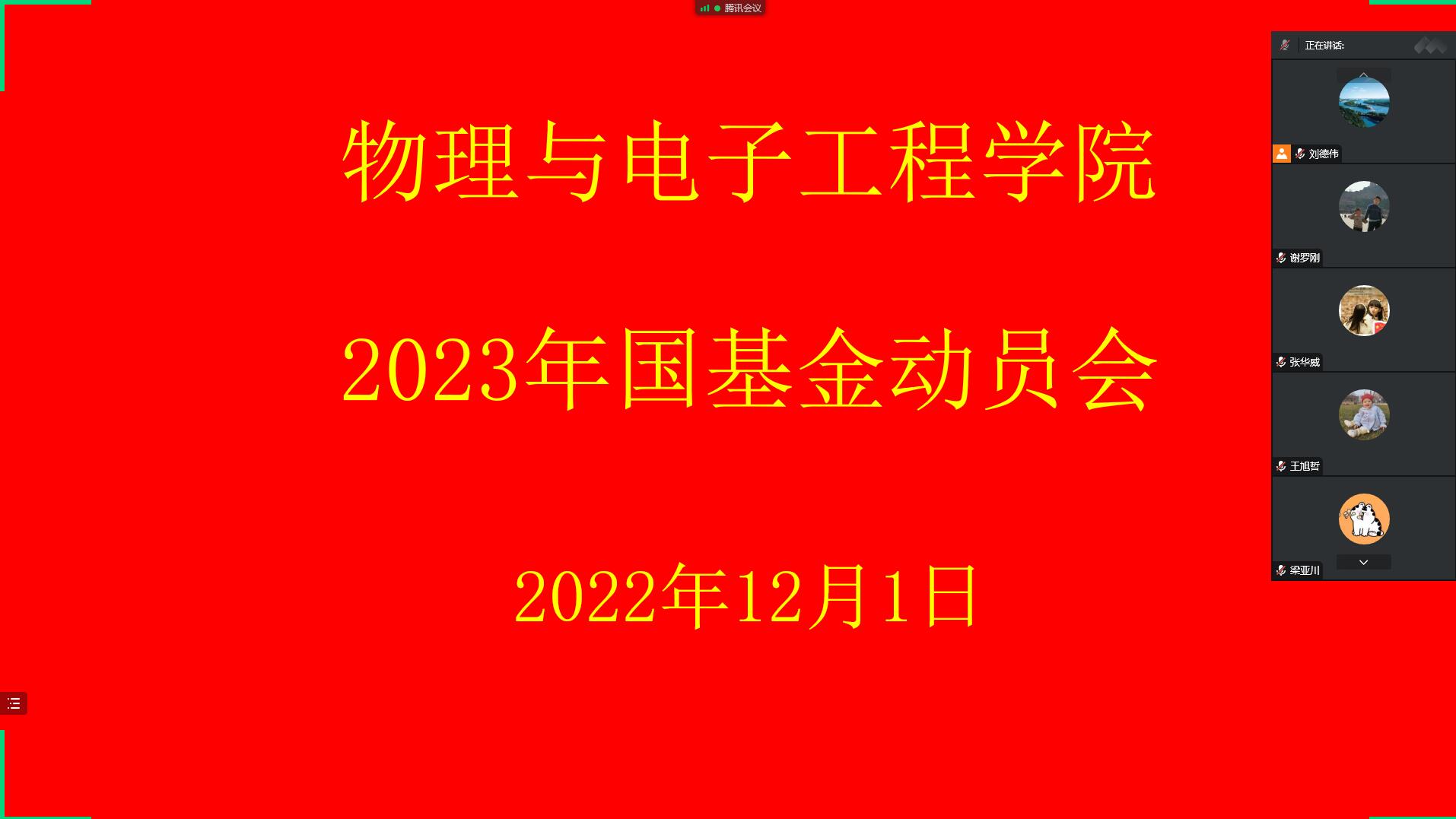 根据学校2023年度国家自然科学基金申报工作安排,结合学校疫情防控要求,12月1日下午,物理与电子工程学院通过腾讯会议召开了国基金动员会。学院符合申报条件的老师参加了本次会议,会议由刘德伟副院长主持。