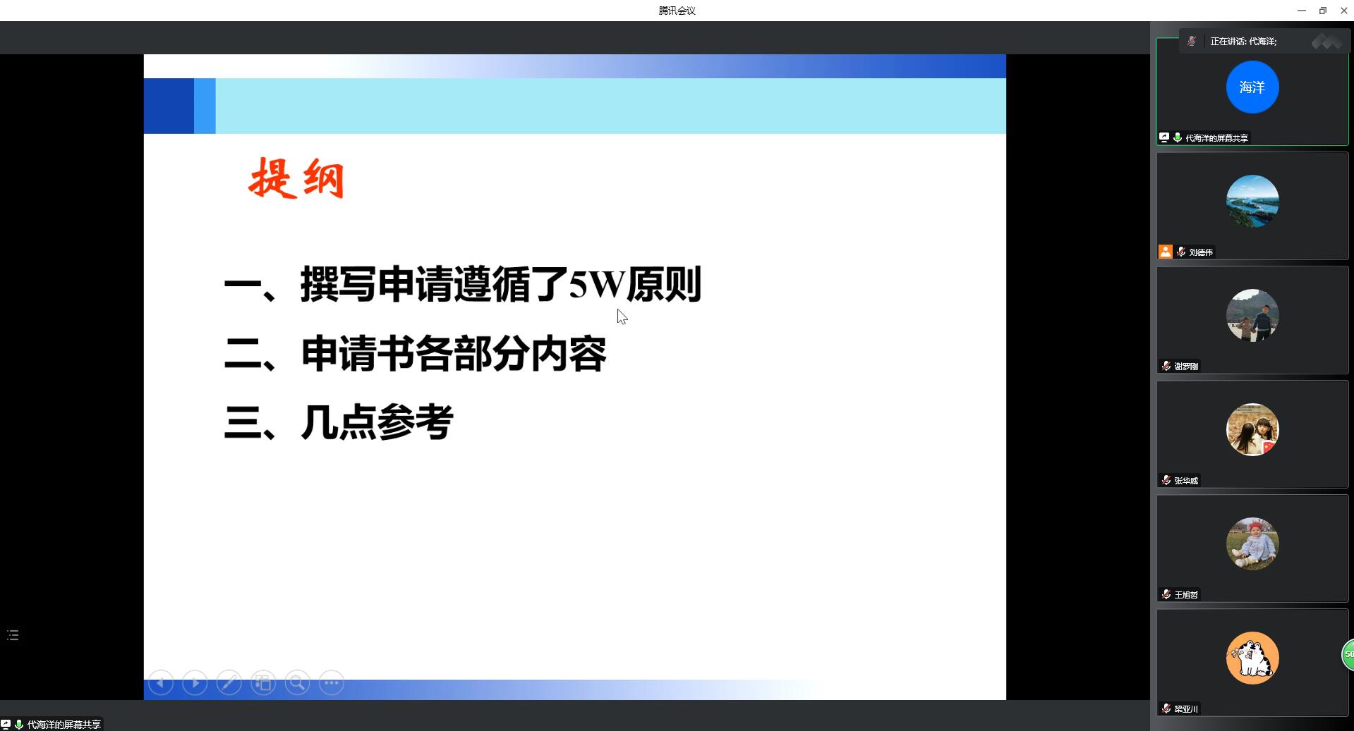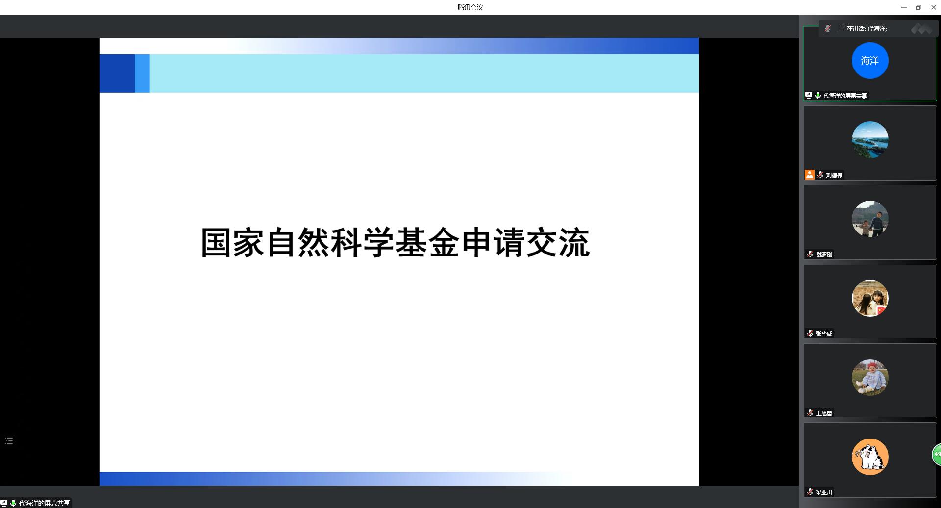 学院代海洋老师分别从国基金项目的选题、摘要、立项依据、国内外现状分析、研究内容、研究目标、拟解决的科学问题、项目特色与创新之处、研究方案等方面分享了申请书撰写的心得体会。王岩老师结合个人申报经历,分别从前期准备、申请书撰写技巧及申报注意事项等方面与参会老师进行了经验交流。