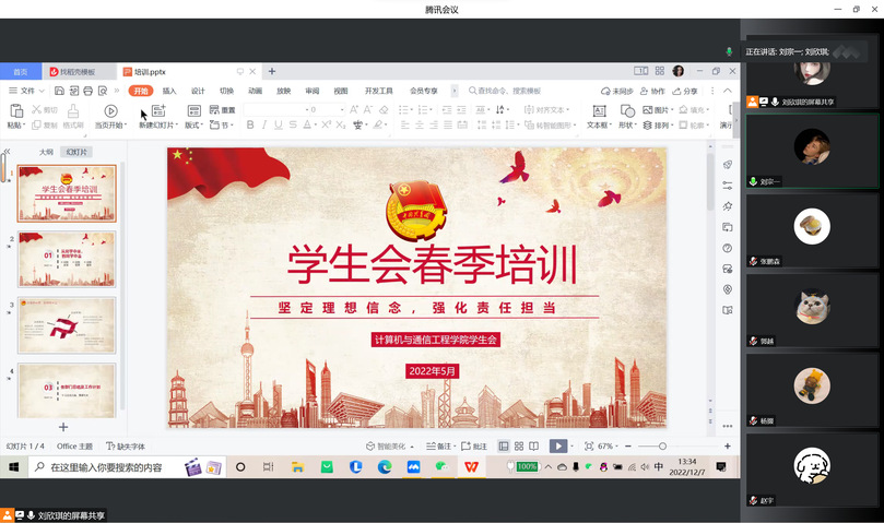 为深入贯彻落实习近平总书记关于青年工作的重要思想,着力培养信仰坚定、能力突出、素质优良、作风过硬的青年政治骨干,提高学生干部理论素养、研究能力和实践水平,引导学生骨干学党史、强信念、跟党走,5月18日,计算机与通信工程学院开展线上干部培训活动,学院团委书记孟牒老师和团干朱妍老师主讲,学生会全体成员参加。