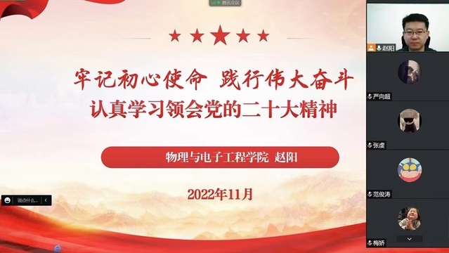 11月29日,物理与电子工程学院党委书记赵阳以《牢记初心使命、践行伟大奋斗》为主题讲授专题思政课,学院全体学生党员和第14期发展对象聆听了思政课。
