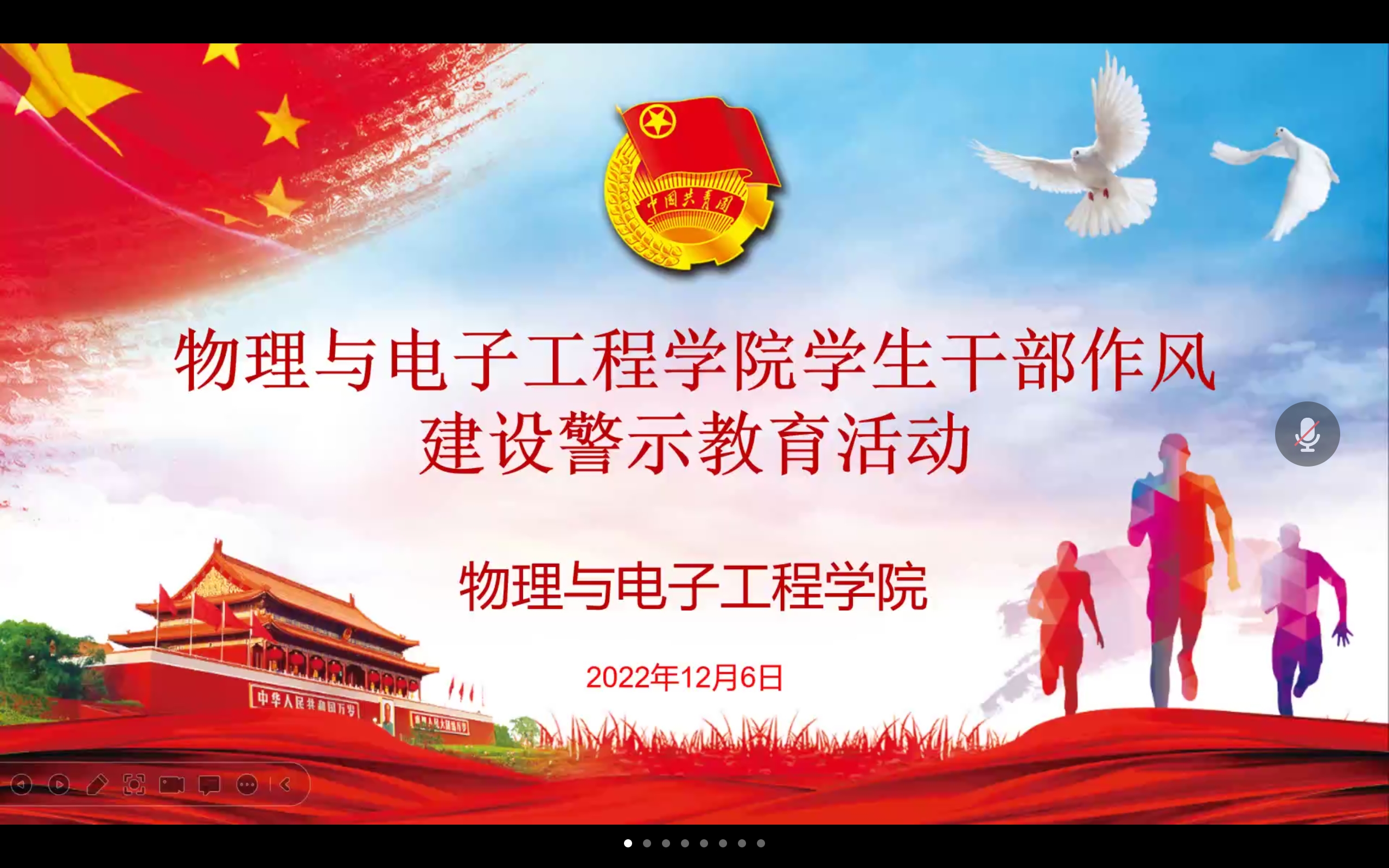 为进一步加强学生会作风建设,提高团学干部的服务意识,塑造良好的组织形象,12月6日,物理与电子工程学院在线上开展作风建设警示教育活动。学院团委书记周芳华老师、学院学生会主席团成员以及全体学生会成员参加了此次活动。