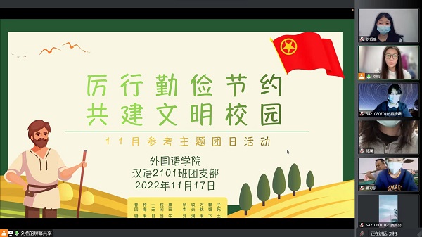 为继承和弘扬勤俭节约的优良传统,倡导“厉行节约、反对浪费”的校园风尚,2022年11月,外国语学院各团支部组织开展“厉行勤俭节约,共建文明校园”主题团日活动。