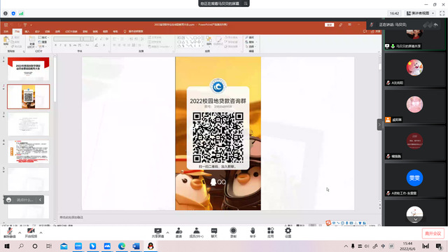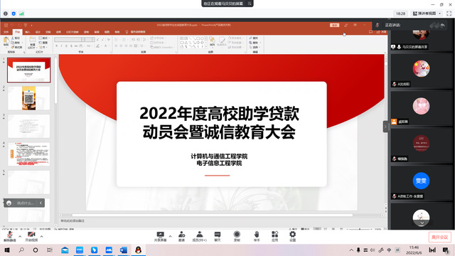 为做好我院2022年高校国家助学贷款政策宣传工作,确保学生能够及时、便捷地获知高校国家助学贷款政策,2022年6月6日下午15点30分,计算就与通信工程学院(电子信息工程学院)在线上腾讯会议召开了“助学、圆梦、育人”2022年助学贷款动员会暨诚信教育大会。学院党委副书记王艳军书记,资助负责老师马贝贝老师、王建新老师以及各班级学生代表参加会议。