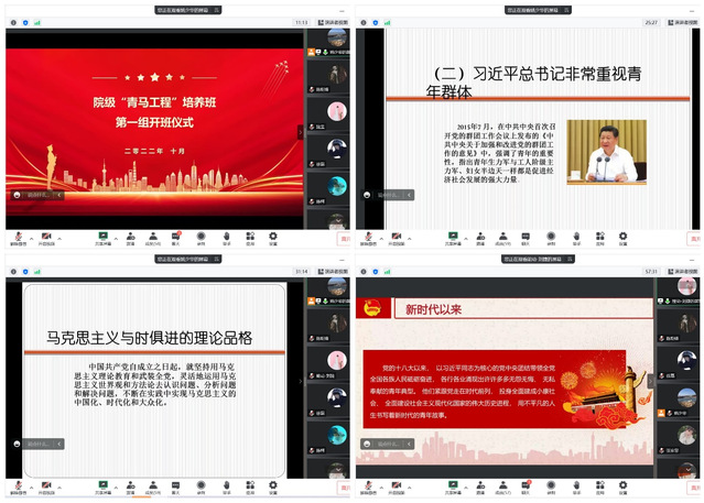 感悟时代,珍惜韶华;传承薪火,青春向党。为进一步加强青年学生的理想信念教育,培养信仰坚定、能力突出、素质优良、作风过硬的青年政治骨干。院级“青马工程”培养班第一组于10月8日晚上18:30,在线上进行了培养班第一组的开班仪式。仪式由经济与管理学院团委书记姚少华和能源与动力学院团委书记刘捷老师共同主持。