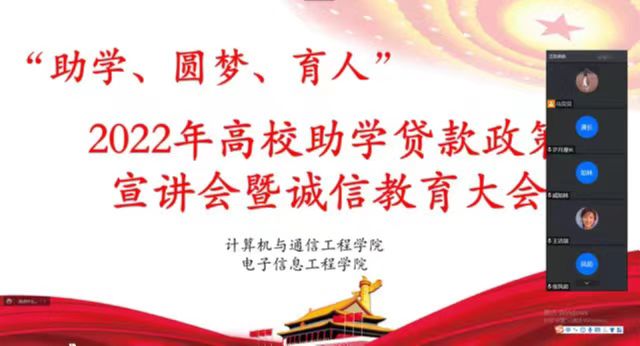 为加强同学们对助学贷款政策的认识,进一步做好诚信教育和资助育人工作,使学生全面了解国家助学贷款政策,促进广大学子顺利完成学业,9月12日,计算机与通信工程学院马贝贝老师和王建新老师及新生辅导员召开线上国家高校助学贷款宣讲会,为学生详细讲解贷款资助政策。
