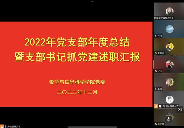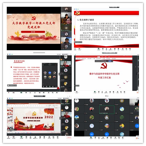 12月15日下午,数学与信息科学学院通过线上形式开展了党支部年度总结暨支部书记抓党建述职报告会,学院领导班子,各支部书记、党员代表和教师代表参加,会议由党委书记郭晓丽主持。