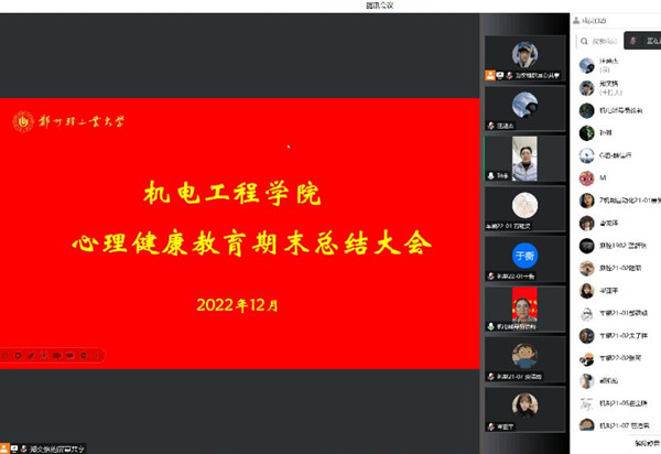2022年12月15日下午,机电工程学院通过腾讯会议线上召开了期末心理健康教育工作总结大会。学院党委副书记孙琳、心理部成员及全体心理委员参加了此次会议,会议由负责心理健康教育的专职辅导员徐莉老师主持。