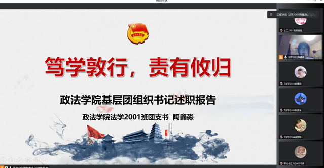 为深入学习贯彻党的二十大精神,加强新时代共青团的基础建设,全面考核我院基层团支部的工作,12月9日晚,政法学院召开线上2022年度基层团支部书记述职评议大会,学院团委书记刘栩静老师、各班级团支部书记、团员代表参加了此次会议。