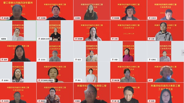 12月22日下午,附属学校四届四次教职工暨工会会员大会通过钉钉视频会议线上举行。附属学校全体正式教职工参加会议,外聘教师代表列席会议。大会由工会主席张宁主持。