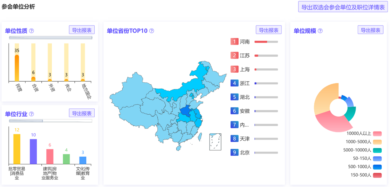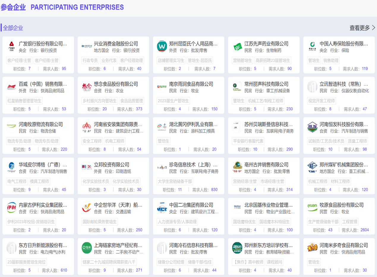 本场空中双选会吸引了来自北京、上海、江苏、浙江、天津、安徽、内蒙古、湖北、河南等省72家用人单位网上报名,经过岗位匹配和资格审核,共邀请了包括中国人寿、中国二冶、广发银行、伊利股份、亳州古井、兴业消费金融、郑州煤矿机械、百威销售、立邦投资等在内的50家省内外名优企业参会,其中国企央企7家,外资合资企业8家,知名民企(上市公司)30余家,提供职位343个,岗位需求9801个。参会企业招聘主要面向经济贸易类、营销类、财会类、管理类、电商物流类专业毕业生,同时也面向建筑类、食品类、机械类、计算机类等专业毕业生。本场空中双选会突破了空间和地域限制,吸引了来自河南农业大学、河南工业大学、河南科技大学、河南师范大学、商丘师范学院、洛阳理工学院、信阳农林学院、安阳工学院等省内14所高校的1000余名毕业生关注和参会。
