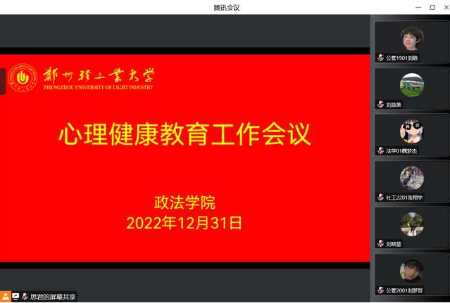 12月31日晚上,政法学院召开心理健康教育工作期末总结会,学院党委副书记刘放美、心理工作室成员、各班级心理委员和二级蒲公英使者参加会议,会议由学院心理专职老师李昊轩主持。