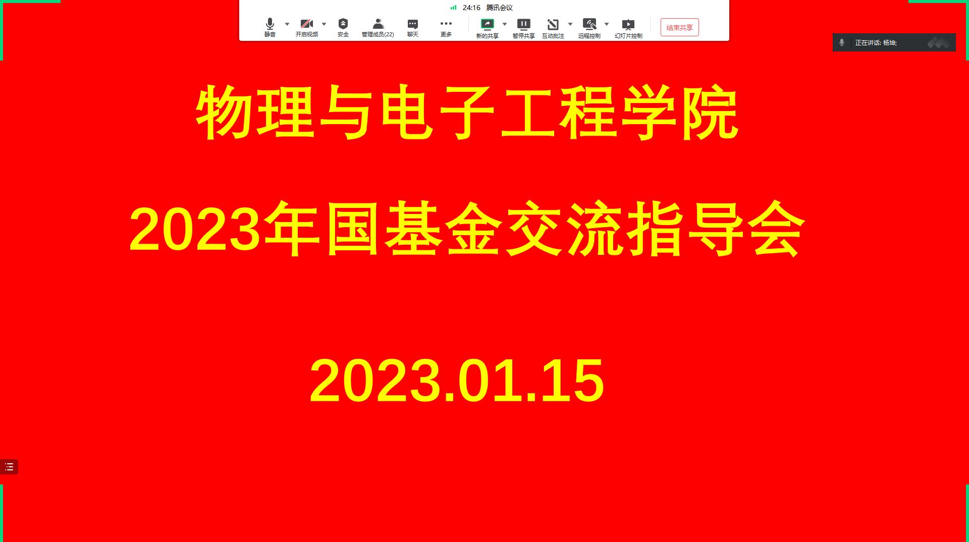 为切实提高2023年度国家自然科学基金申报质量,2023年1月15日,物理与电子工程学院邀请南京大学刘俊明教授和北京航空航天大学吕广宏教授进行学术交流,并对我院国家自然科学基金项目申报进行了论证指导。物理与电子工程学院杨坤院长、刘德伟副院长和全体申报国家自然科学基金的老师参加了本次学术交流。